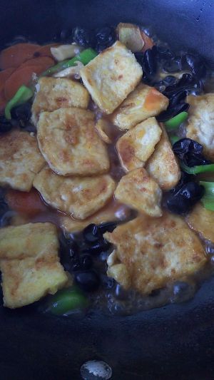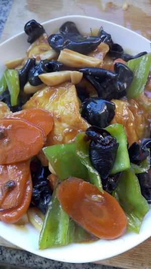 将胡萝卜、青椒、黑木耳和豆腐一起放入锅中翻炒(也可加一些自己喜欢的素材一起,比如金针菇,肉片等) 加水,盖锅盖煮熟
