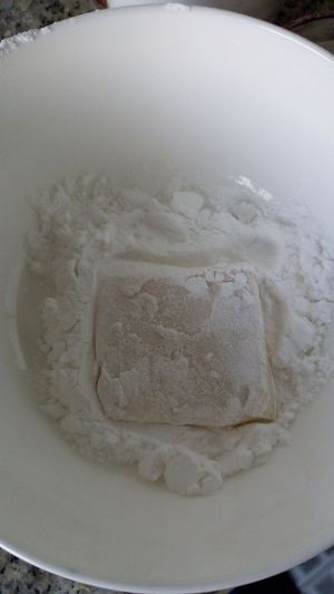 豆腐切块,每块两面在淀粉中粘下