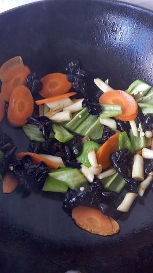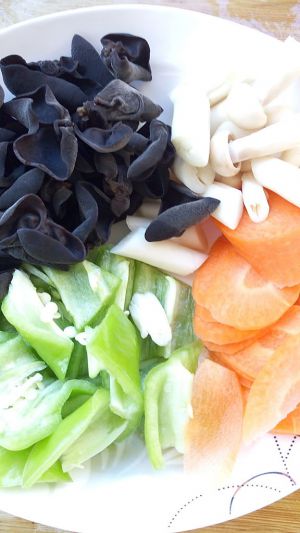 木耳泡发 胡萝卜 尖椒青椒切片 葱蒜切末备用