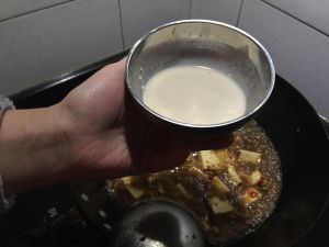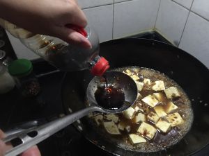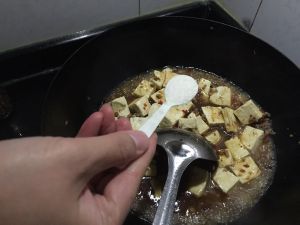 加水、生抽、老抽、盐、豆瓣酱、煎好的豆腐,加盖煮开。用淀粉勾芡,放鸡精,即可关火