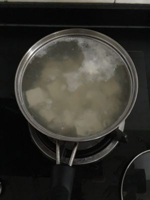 豆腐切丁用沸水加盐煮2分钟,这样豆腐可以去除豆腥味,烧出来的豆腐更好吃,煮好豆腐泡在凉水里,这样豆腐不会粘在一起!