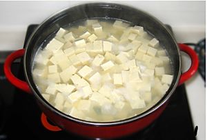 准备开水 把豆腐放开水煮两分钟 防止豆腐散