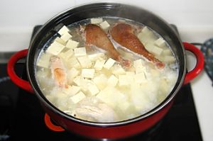 烫过的豆腐再加入开水、几块熟鸡肉、3片姜,煮沸。