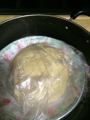 面粉和完发酵~有些紫薯还没弄碎所以一小块一小块的~但是个人审美角度来说很喜欢阿(_`)..对了 发酵过程中记得封个保鲜膜阿什么的..不然表面容易干..发酵依旧半小时~但是环境温度不一样,量不一样时间也会不一样喔~