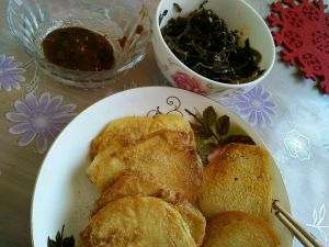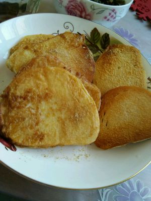 打鸡蛋这步没有拍照,用碗打入鸡蛋,鸡蛋里放盐(根据个人口味),搅拌均匀,放入切好的馒头片,两面沾蛋浆