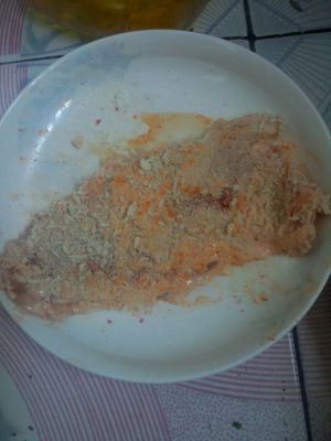 将鸡排滚上面粉与淀粉后,再撒上面包屑