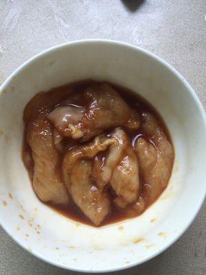 鸡胸肉横切薄片儿,用刀背敲几下,肉会变大变薄一些,加入生抽、料酒、盐、胡椒粉腌制半小时以上。我腌制了一下午,更入味儿