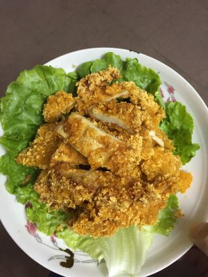 最后一步,下油锅咯~一定注意开小火不然外表层先糊鸡肉还没有熟。放油的量刚刚没过鸡排就好。炸至金黄色出锅盛盘~撒上适量孜然粉,可以根据个人口味添加千岛酱或者番茄酱都可以。