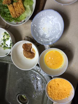 准备淀粉、鸡蛋液、面包糠,按这个顺序让腌制好的鸡胸肉一次沾匀。