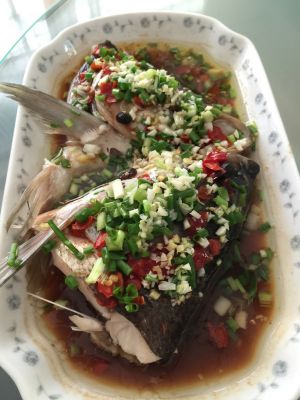 放锅里蒸20分钟后取出并倒掉盘里的水,并用凉开水倒入盘里冲洗鱼头同时沥干水(提鲜且让鱼肉口感更佳),把青椒鸡丁剁椒和葱花均匀地洒在鱼头上。