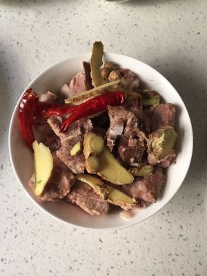 排骨剁块、焯水,煮排骨的水不要,撇去浮末。干红辣椒用开水洗净,姜留皮切片,放碗中待用。
