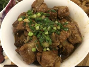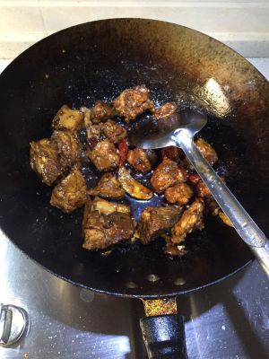 锅中放油烧热,将干红椒、姜、郫县豆瓣放锅中小火爆香,放入排骨后,另放盐、老抽、蚝油、料酒,出锅放生抽。因为生抽忌高温长时间使用。此步骤不宜过长,只需排骨均匀上色即可。