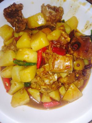 放入切好的土豆,翻炒,放盐,八角,香料,等!放250克水。放青红椒,盖上盖子煮10分钟!