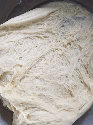 和好的面揉光,把揉好的面团放在盆中,用一块湿布盖上或者是保鲜膜,放置温暖处进行发酵; 大约1小时后,面团发至两倍大,用手抓起一块面,内部组织呈蜂窝状,醒发完成;