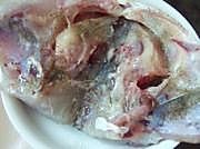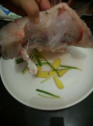 盘子内放几片姜和葱段,鱼头铺在上面;