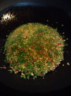 把剁好的生姜、葱、辣椒放烧热的油中炸香