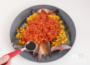 鱼头翻面,取适量黄灯笼酱和剁椒酱铺在鱼头上。