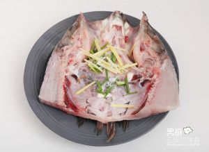 花鲢去鳞去鳃去内脏,清洗干净,沥干水分,取下鱼头,沿鱼脊骨纵向剁开,背部相连。用盐和白酒涂均匀抹鱼头正反面,腌制10分钟。再将鱼头的背部朝下,鱼身铺上切好的葱丝和姜丝。