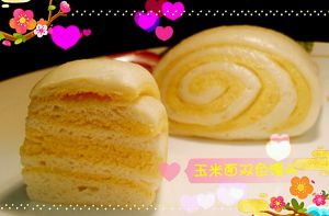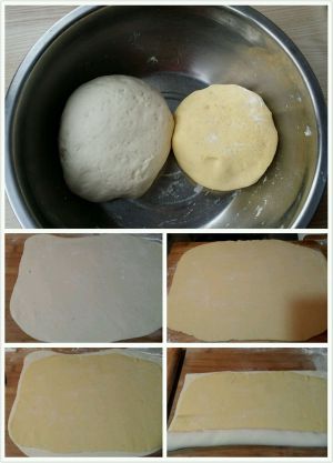 把醒发好的面再次揉匀,气泡揉出,分别把白面团,玉米面团擀成片状,把玉米面片放在白面上。,这些面我分了3次呦。