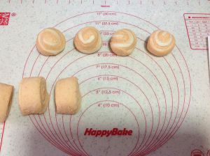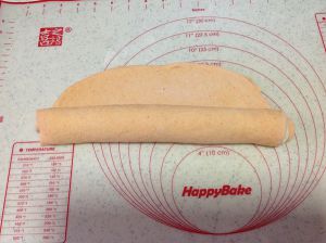 按照胡萝卜、原味、胡萝卜的顺序叠加三块薄片, 然后卷起。