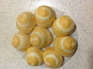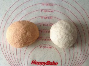 取出排气,分出大部分(约3/4)面团加入少许红色和黄色,调成肤色,作为包子的主要部分。 (和原色面团对比一下看看,浅浅的就可以喽)