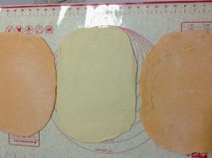 发酵完成的胡萝卜面团一分为二,分别擀成两块长方形薄片,原味擀成一块长方形薄片。