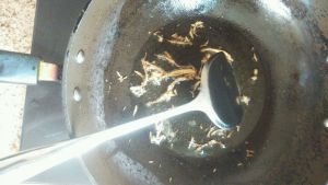 放几片姜,持续翻炒水份蒸发掉,盛出备用;