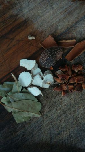 两枚大料,香叶2片,红辣椒1枚,洗干净,掰成小块