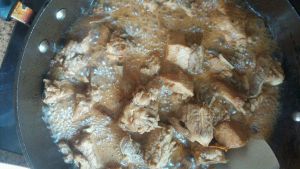 把刚刚调好的糖醋汁倒进去翻炒均匀,加开水,末过排骨,务必记住加开水,凉水的话,这个肉就硬了,热胀冷缩;