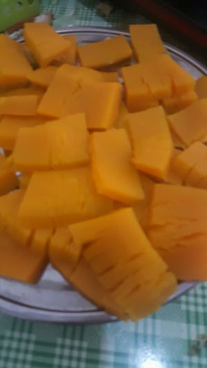 我用的是一般的老南瓜,去皮,去瓤,切片。上锅蒸。(切片是为了快点儿熟)当然土豪可以整个南瓜放进去蒸。