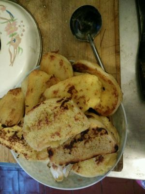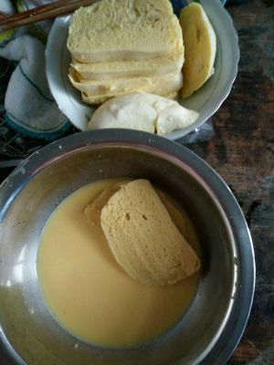 把一片片馒头片放入蛋液里,两面沾均匀。
