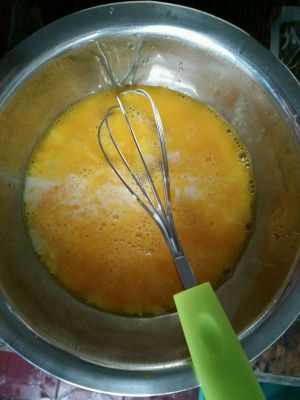 在碗里磕入鸡蛋,加入150毫升牛奶和少许盐搅拌均匀。