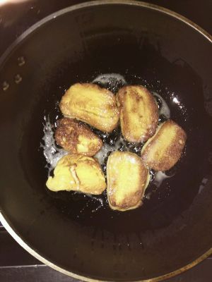 在锅里放入油,把一片片馒头片放入锅里煎至两面金黄,即可出锅。