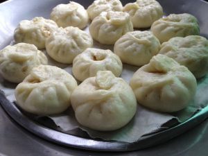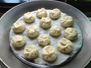 由于我包的包子比较不怎么样,就省略包的过程和馅料的过程,大伙自由发挥哈!蒸笼刷些食用油,放包子!冷水上锅,再在锅里醒发15分钟,开火蒸15分钟,关火后闷5分钟开盖!