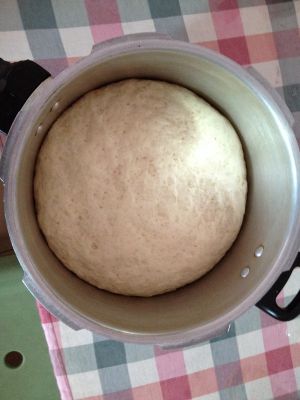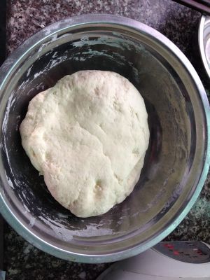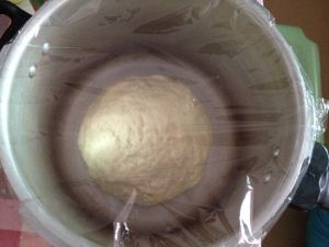 然后放入准备好的盆中,发酵大概30分钟左右,看自己家温度哦,反正就是两倍大的模样,拿出来,按一下不回弹,OK