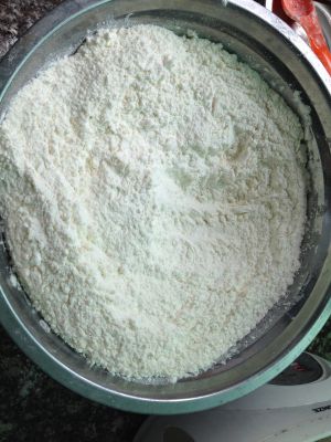 面粉里加入适量的糖粉拌匀,如无糖粉可用少许水融解糖!