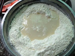 将静置好的酵母水倒入面粉里,拌匀(如前一步无糖粉的,可先倒糖水搅拌,再倒酵母水)如果拌完太干就慢慢加些水,太湿就加些面粉!