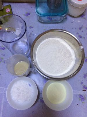 准备好材料。用准备好的温水倒酵母粉里,使其融化!我用的是儿子得奶粉!
