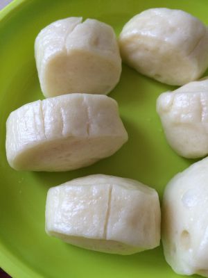 发酵好后,继续揉,把里面的空气揉掉,搓成长条形切断!放蒸锅里(里面放热水)盖上盖子醒几分钟再开始蒸!蒸好后别马上开盖看,等一会再揭开盖! 样子不怎么好看哈,忙孩子,时间太有限了,味道还是挺好的,孩子爱吃!