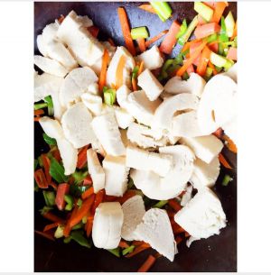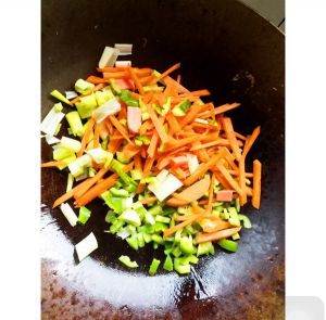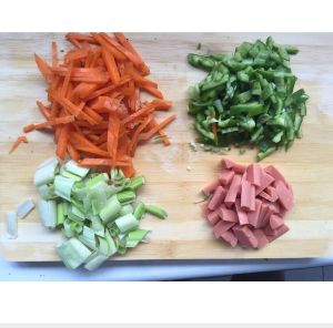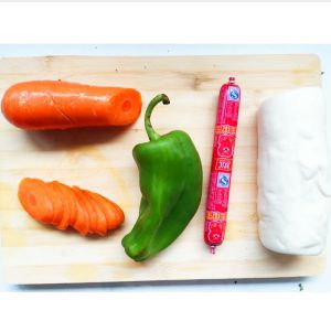 香肠切片 胡萝卜切丝 大葱切碎 辣椒切成颗粒
