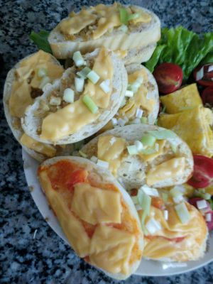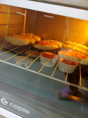 馒头片上均匀铺上蒜泥,入烤箱180℃8分钟左右,拿出铺上芝士片再烤10分钟左右,芝士融化既可,要看着火,别烤焦了。我同时烤了很多东西,节约能源嘛~~