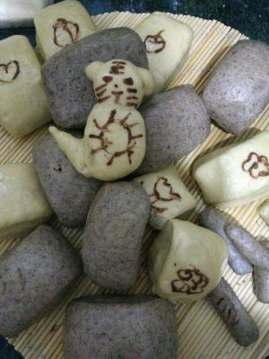 馒头蒸好后趁热将表情粘上,如果粘不牢可以稍粘点水,这样,可爱的表情馒头就做好了。