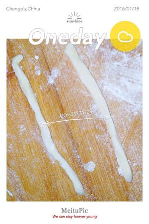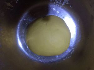 紫薯蒸熟压成泥,加入3汤匙半的面粉、糖和温水揉成面团备用