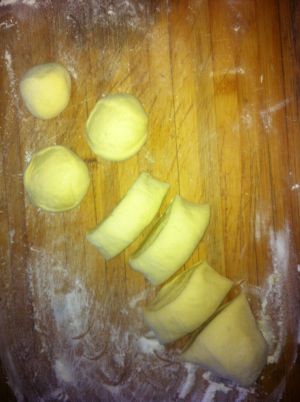 把发酵好的揉几下排气,然后搓成长条型,用刀切成8-10段,然后在每段上划一个1/3深的口子。我顺便做了个兔子造型给孩子乐乐。把它们放蒸笼上呆半小时。