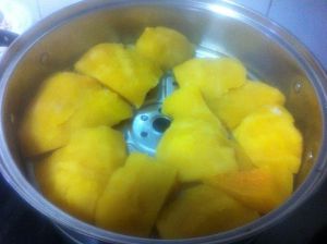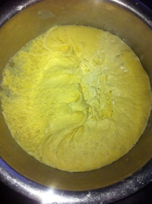 蒸熟的南瓜、盐、糖、放入面粉中,酵母用温水调开加入面粉中