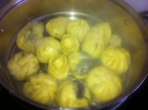 锅里水烧开,这个时间也足够让面团二次醒发了, 水开上锅大火蒸十分钟,