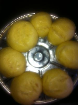 加入发酵粉揉成面团,半小时发好面,揉成馒头状,用大拇指由馒底向心部顶空,为的是易蒸透,上开水锅蒸15分钟,即闭火收气,1分钟后,出锅!