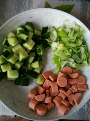 锅中放油,倒入胡萝卜翻炒,倒入西葫芦,倒入馒头丁,放少许生抽,放适量盐翻炒,倒入黄瓜火腿肠青菜翻炒几下即可