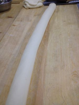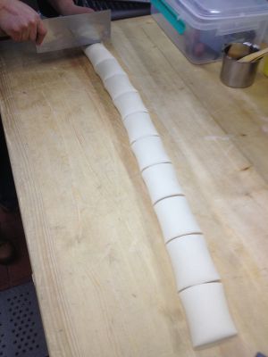 醒发好的面团反复揉搓排气,将面团揉成长条分割成大小相等的剂子,再将面团揉成光滑的圆形。