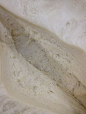 发至两倍大后将面团排气,揉光滑,切开看没有大蜂窝,而且蜂窝均匀,然后放一边松弛10分钟。